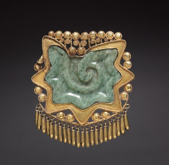 "This extraordinary pendant consists of a conch shell section carved in jade, enclosed in a delicate gold frame with tiny dangling bells. This symbol was worn by the deity Quetzalcoatl (Feathered Serpent) a culture hero credited in one myth with creating human life by sprinkling his blood on ground bones. The pectoral may have been worn by a priest, or by a ceremonial impersonator of Quetzalcoatl."